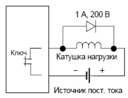 Недостатком данной схемы является затягивание затухания тока. Для частичной компенсации этой особенности можно воспользоваться скоростным диодом. Однако для простых схем, где нет рядом пролегающих чувствительных цепей, можно воспользоваться обыкновенным диодом с напряжением пробоя 1 кВ и выше.